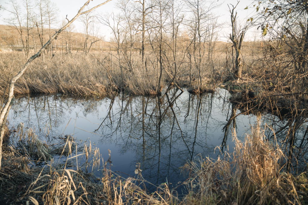 既存の道を活かす、思い入れのある現場 一方で、松村さん自身が所有する150haの森は、 湿地帯に隣接する特別な環境。 将来的にはラムサール条約登録の可能性もある場所です。